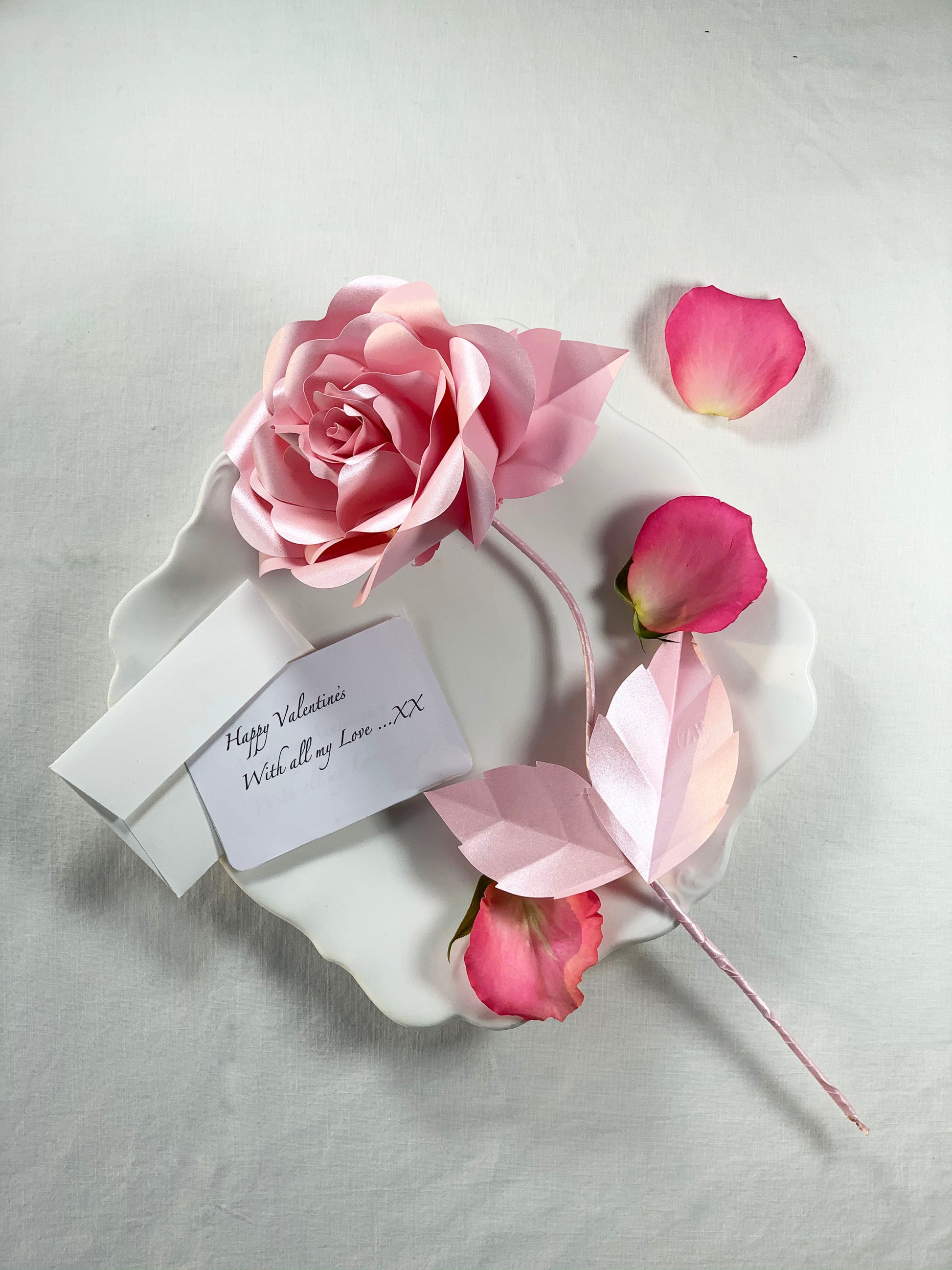 Presentado en una caja de bucarán blanco, cada Paper Rose viene con una pequeña tarjeta de mensaje y un sobre para que escriba su propio mensaje personal de amor o agradecimiento.